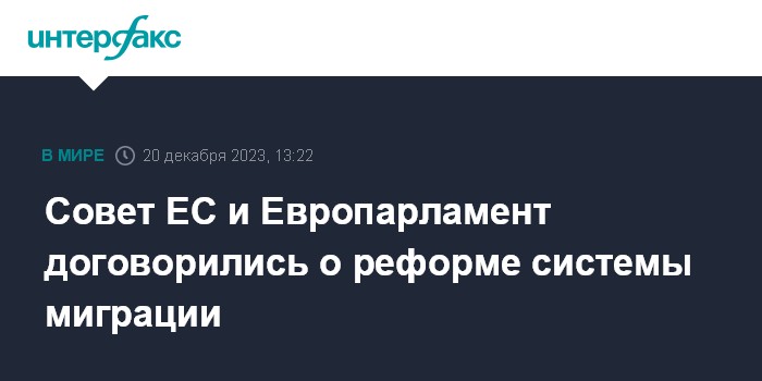 Москва. 20 декабря. INTERFAX.RU - Совет ЕС и Европейский парламент достигли политического соглашения по реформе системы миграции и предоставления убежища в Евросоюзе, предполагается полный пересмотр правовой базы ЕС в этой сфере.
