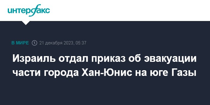 Москва. 21 декабря. INTERFAX.RU - Израиль отдал приказ об эвакуации населения из отдельных районов главного южного города Газы - Хан-Юниса, сообщает Управление ООН по координации гуманитарных вопросов (УКГВ).