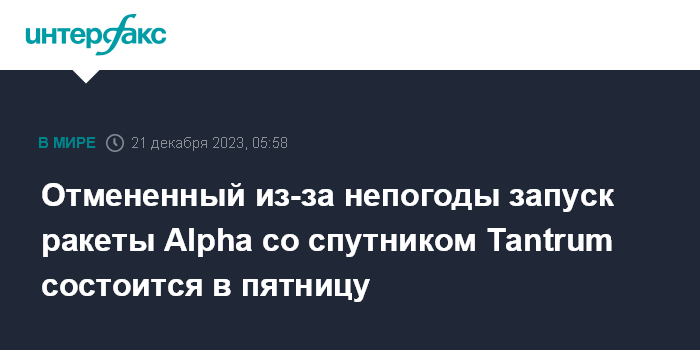 Москва. 21 декабря. INTERFAX.RU - Новая попытка запуска американской ракеты Alpha со спутником Tantrum корпорации Lockheed Martin будет предпринята в пятницу, сообщила компания-разработчик носителя Firefly Aerospace.