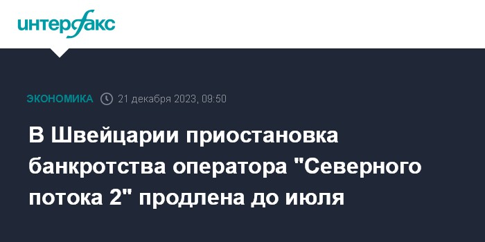 Москва. 21 декабря. INTERFAX.RU - Суд швейцарского кантона Цуг продлил мораторий на банкротство оператора "Северного потока 2" Nord Stream 2 AG еще на 6 месяцев - теперь до 10 июля 2024 года, говорится в сообщении суда.