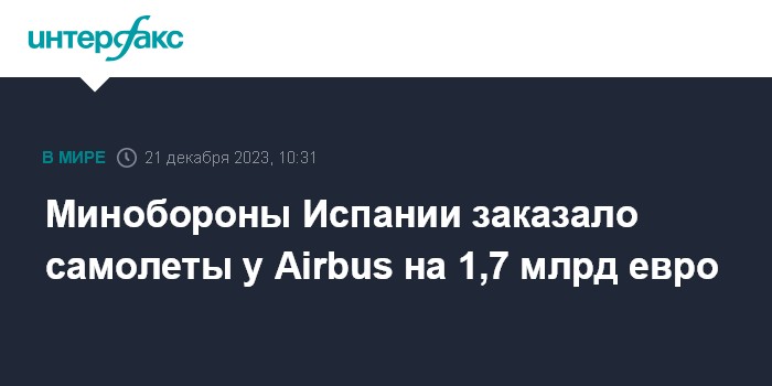 Москва. 21 декабря. INTERFAX.RU - Европейская аэрокосмическая корпорация Airbus SE получила от Министерства обороны Испании заказ на поставку 16 военных самолетов на общую сумму 1,695 млрд евро.