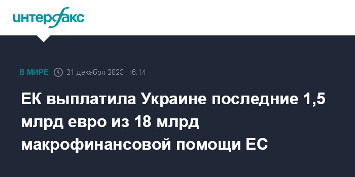 Москва. 21 декабря. INTERFAX.RU - Еврокомиссия (ЕК) объявила в четверг о выплате Украине последнего транша макрофинансовой помощи в 1,5 млрд евро в рамках пакета в 18 млрд евро на 2023 год.