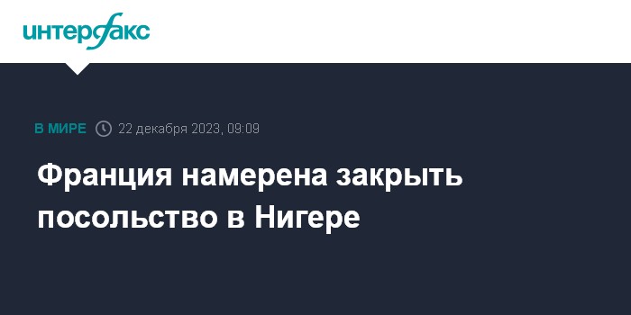 Москва. 22 декабря. INTERFAX.RU - Франция собирается закрыть свое посольство в Нигере, сообщает Associated Press со ссылкой на письмо, направленное сотрудникам французской дипмиссии из числа местного населения.
