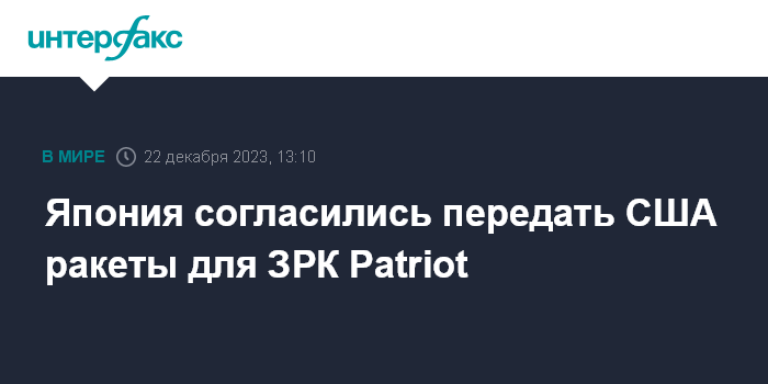Москва. 22 декабря. INTERFAX.RU - Власти Японии решили направить США ракеты для зенитных ракетных комплексов (ЗРК) Patriot, что в свою очередь упростит для Вашингтона снабжение Украины собственными зенитными ракетами. Об этом сообщает в пятницу The Wall Street Journal (WSJ) со ссылкой на источники.