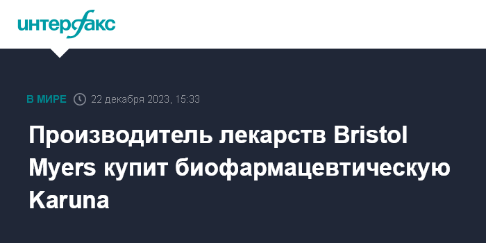 Москва. 22 декабря. INTERFAX.RU - Американский производитель лекарственных препаратов Bristol Myers Squibb достиг соглашения о покупке конкурирующей Karuna Therapeutics Inc. за $12,7 млрд.