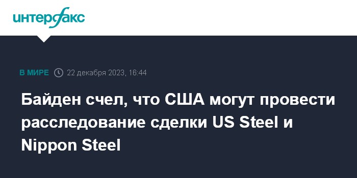 Москва. 22 декабря. INTERFAX.RU - Сделка по покупке американской сталелитейной US Steel японской компанией Nippon Steel может требовать тщательного изучения на предмет влияния на национальную безопасность и надежность цепочек поставок США, полагает президент страны Джо Байден.