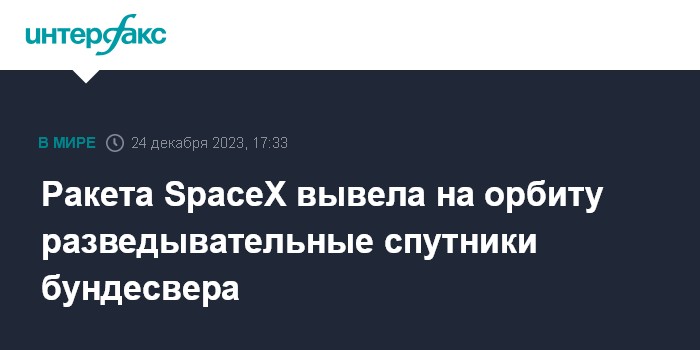 Москва. 24 декабря. INTERFAX.RU - Ракета Falcon 9 в воскресенье успешно вывела на орбиту два спутника радиолокационной разведки министерства обороны Германии SARah-2 и 3, сообщила компания-разработчик носителя SpaceX.