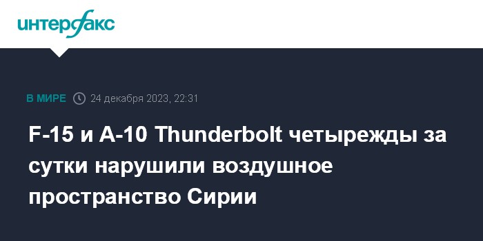 Москва. 24 декабря. INTERFAX.RU - Два истребителя F-15 и два штурмовика A-10 Thunderbolt коалиции западных стран четыре раза за сутки нарушили воздушное пространство Сирии, сообщил журналистам на брифинге заместитель руководителя российского Центра по примирению враждующих сторон в Сирийской Арабской Республике контр-адмирал Вадим Кулить.