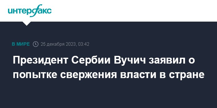 Москва. 25 декабря. INTERFAX.RU - Попыткой свержения законно избранной власти Сербии, спровоцированной из-за рубежа, назвал президент страны Александр Вучич беспорядки в Белграде, участники которых требовали отмены результатов состоявшихся неделю назад парламентских и местных выборов.