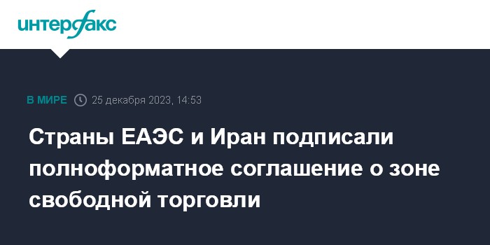 Москва. 25 декабря. INTERFAX.RU - Страны Евразийского экономического союза (ЕАЭС) подписали полноформатное соглашение о свободной торговле с Ираном, которое должно прийти на смену действовавшему с 2019 года временному соглашению.