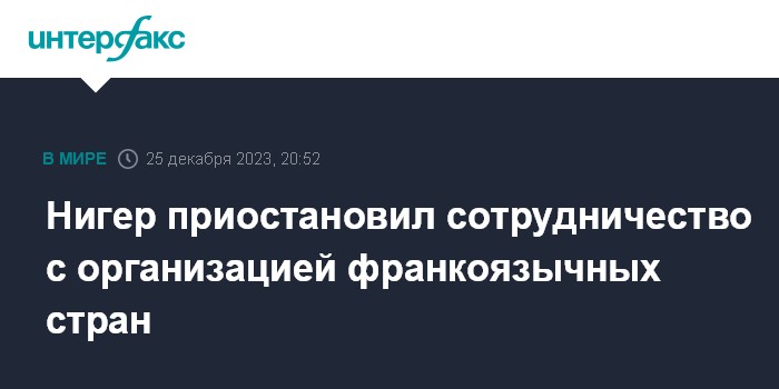 Москва. 25 декабря. INTERFAX.RU - Власти Нигера в рамках сокращения связей с Францией приостановили сотрудничество с Франкофонией - международной организацией франкоязычных стран со штаб-квартирой в Париже, сообщает портал Afrik со ссылкой на представителя нигерских военных.