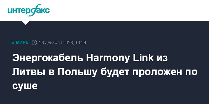 Москва. 28 декабря. INTERFAX.RU - Литва, Польша и Еврокомиссия достигли договоренности по строительству энергомоста между двумя странами Harmony Link по суше, вдоль железнодорожного полотна европейской колеи Rail Baltica, а не по дну моря, как предполагалось ранее.
