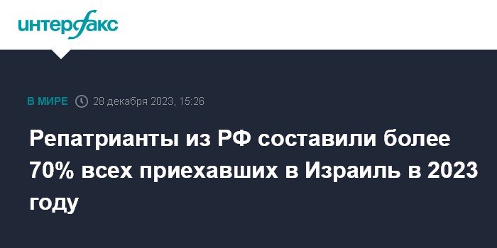 Москва. 28 декабря. INTERFAX.RU - Россияне составили подавляющее большинство репатриантов, прибывших в Израиль в 2023 году, свидетельствуют данные израильского Центрального статистического бюро, опубликованные СМИ в четверг.