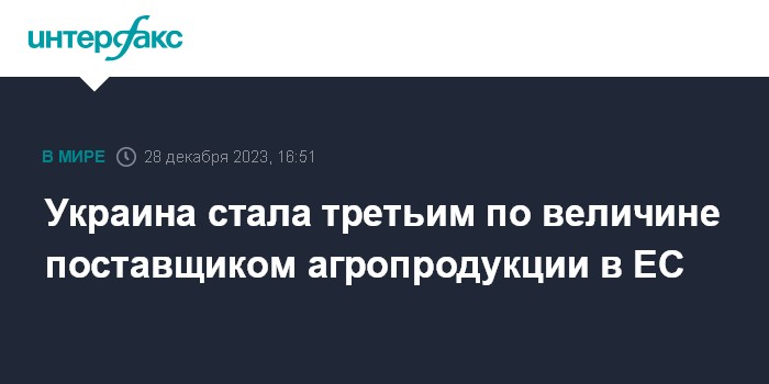 Москва. 28 декабря. INTERFAX.RU - Украина, в 2022 году получившая право на беспошлинные поставки продовольствия в ЕС, в текущем году стала одним из крупнейших поставщиков сельхозпродукции в Евросоюз, сообщило польское издание farmer.pl со ссылкой на отчет Европейской комиссии.