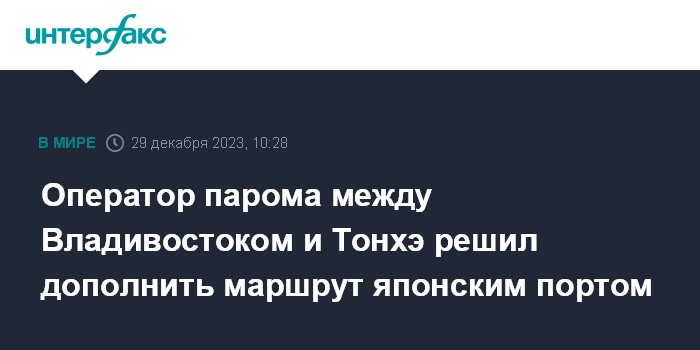 Москва. 29 декабря. INTERFAX.RU - Южнокорейский оператор морского парома Eastern Dream, выполняющего регулярные рейсы между Владивостоком и Тонхэ (провинция Канвондо в Корее), планирует весной 2024 года расширить маршрут за счет японского порта Сакаиминато (префектура Тоттори).
