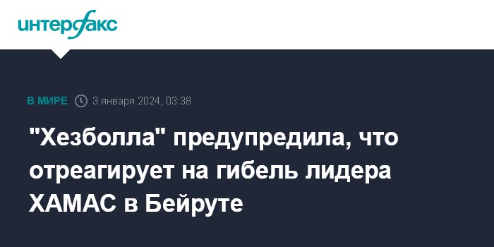 Москва. 3 января. INTERFAX.RU - Ливанское движение "Хезболла" обещает отреагировать на гибель заместителя председателя политического бюро ХАМАС Салеха аль-Арури, сообщают ближневосточные СМИ.