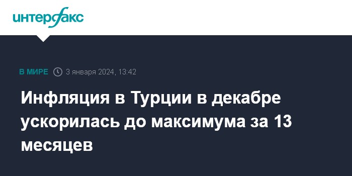 Москва. 3 января. INTERFAX.RU - Темпы роста потребительских цен в Турции в декабре ускорились до максимума за 13 месяцев, с ноября 2022 года.
