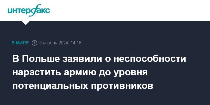 Как сообщалось, экс-министр национальной обороны Польши Мариуш Блащак, потерявший этот пост в середине декабря 2023 года, заявлял о намерении нарастить численность вооруженных сил страны минимум до 300 тыс. человек к 2035 году, что позволит "воплотить в жизнь проект сильнейшей сухопутной армии Европы". Блащак заявлял, что у Польши есть "демографический потенциал для 300-тысячной армии".