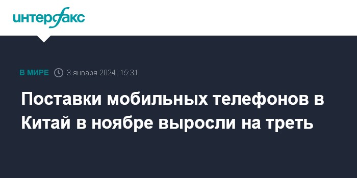 Москва. 3 января. INTERFAX.RU - Поставки мобильных телефонов в КНР в ноябре увеличились на 34,3% относительно того же месяца годом ранее и составили 31,21 млн штук. Об этом сообщила Академия информационных и коммуникационных технологий (CAICT) при министерстве промышленности и информатизации страны.