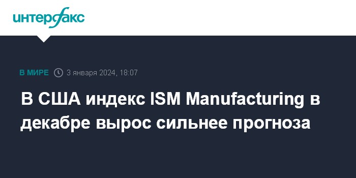 Москва. 3 января. INTERFAX.RU - Индекс деловой активности в производственном секторе США (ISM Manufacturing) в декабре увеличился до 47,4 пункта с 46,7 пункта месяцем ранее, говорится в отчете Института управления поставками (ISM).