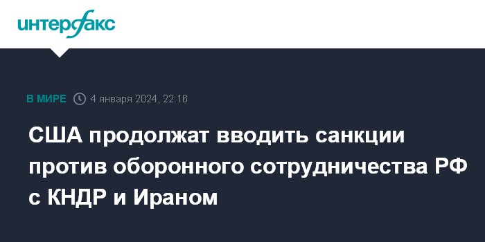 Москва. 4 января. INTERFAX.RU - США намерены вводить дальнейшие санкции в отношении тех, кто помогает сотрудничеству в сфере обороны РФ с Северной Кореей и Ираном, заявил в четверг представитель американского Совета Национальной безопасности Джон Кирби.