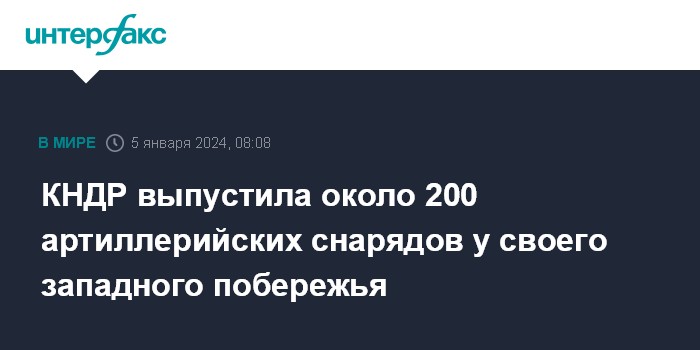 Москва. 5 января. INTERFAX.RU - КНДР произвела запуск 200 артиллерийских снарядов у своего западного побережья в пятницу утром, сообщает "Ренхап" со ссылкой на южнокорейских военных.