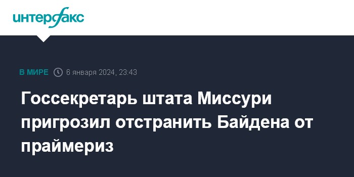 Москва. 6 января. INTERFAX.RU - Госсекретарь штата Миссури Джей Эшкрофт пригрозил не допустить президента Джо Байдена до участия в праймериз, если Верховный суд США не восстановит другого претендента Дональда Трампа в списках участников первичных выборов в штатах Колорадо и Мэн.