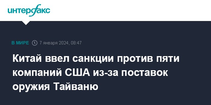 Москва. 7 января. INTERFAX.RU - Китай ввел санкции против пяти американских компаний за недавние продажи оружия Тайваню и заявил США протест, сообщил в воскресенье МИД КНР.