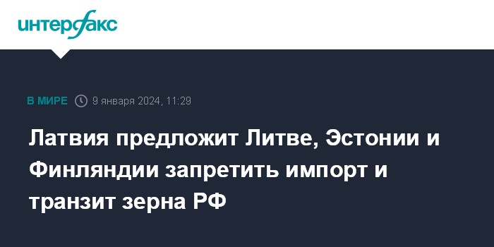 Москва. 9 января. INTERFAX.RU - Латвии необходимо запретить импорт и транзит российского зерна и начать диалог с Литвой, Эстонией и Финляндией для формирования общей позиции по этому вопросу, заявил Латвийскому радио министр сообщения Латвии Каспар Бришкенс.