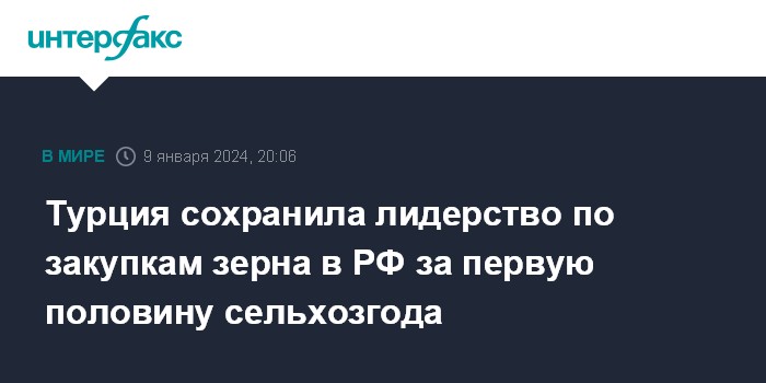 Москва. 9 января. INTERFAX.RU - Турция удержала позицию главного импортера российского зерна по итогам первого полугодия 2023/2024 сельхозгода, но закупки снизила.