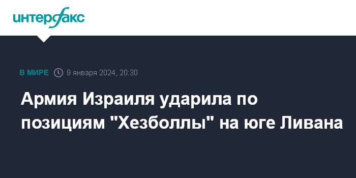 Москва. 9 января. INTERFAX.RU - Армия обороны Израиля (ЦАХАЛ) нанесла несколько авиаударов по объектам инфраструктуры движения "Хезболла" на юге Ливана, а также произвела провела артобстрелы, чтобы сорвать готовящиеся атаки против Израиля, сообщает во вторник The Times of Israel со ссылкой на заявление ЦАХАЛ.