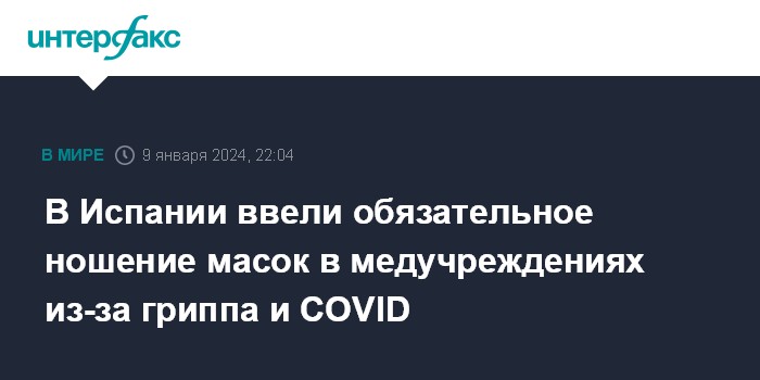 Москва. 9 января. INTERFAX.RU - Правительство Испании вводит обязательное ношение масок в больницах и медицинских учреждениях, сообщают во вторник испанские СМИ.