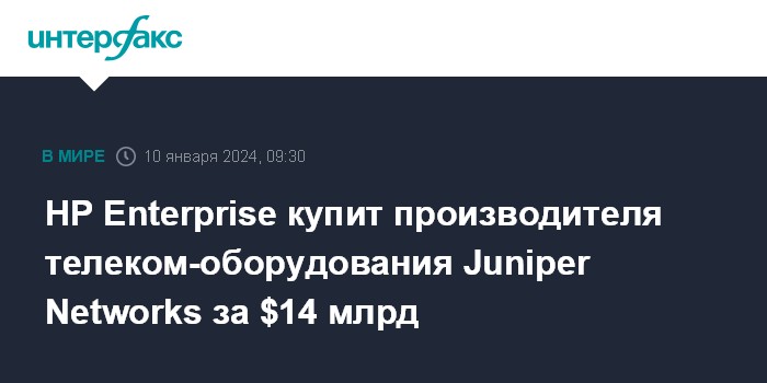 Москва. 10 января. INTERFAX.RU - Hewlett Packard Enterprise (HP Enterprise) покупает производителя телекоммуникационного оборудования и поставщика решений в сфере искусственного интеллекта Juniper Networks за $14 млрд.