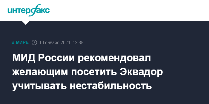 Москва. 10 января. INTERFAX.RU - МИД России рекомендовал согражданам учитывать нестабильность в Эквадоре при планировании поездок в эту страну, ведомству не известно о пострадавших из-за беспорядков россиянах. В министерстве рассчитывают, что власти Эквадора восстановят порядок в стране без внешнего вмешательства.