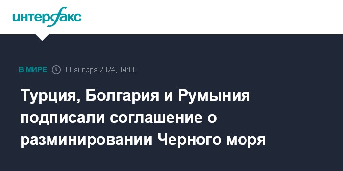 Москва. 11 января. INTERFAX.RU - Министр обороны Турции Яшар Гюлер заявил, что Турция, Болгария и Румыния в четверг подписали соглашение, предполагающее создание целевой группы по расчистке вод Черного моря от дрейфующих мин, сообщает агентство Associated Press (AP).