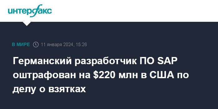 Москва. 11 января. INTERFAX.RU - Германская компания SAP, занимающаяся разработкой программного обеспечения, заплатит свыше $220 млн в рамках соглашения с властями США об урегулировании претензий, касающихся дачи взяток иностранным чиновникам.