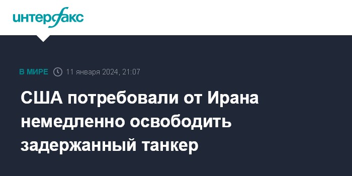 Москва. 11 января. INTERFAX.RU - США призывают Иран незамедлительно освободить задержанный в Оманском заливе танкер и его экипаж, заявил на брифинге представитель Госдепартамента США Ведант Патель.