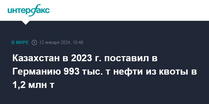 Ранее сообщалось, что квота на 2023 год составляла 1,2 млн тонн нефти. В январе-ноябре прошлого года Казахстан транспортировал 843 тыс. тонн нефти в Германию и планировал в декабре поставить еще 150 тыс. тонн.