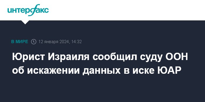 Москва. 12 января. INTERFAX.RU - Юрисконсульт МИД Израиля Тал Бекер на слушаниях в Международном суде ООН назвал искаженными данные в поданном ЮАР иске, в котором действия Израиля в секторе Газа приравнивают к геноциду.