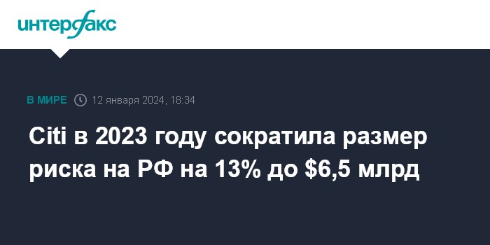 Москва. 12 января. INTERFAX.RU - Американская Citigroup в 2023 году сократила размер риска на Россию на 13% до $6,5 млрд, говорится в презентации к отчетности группы.