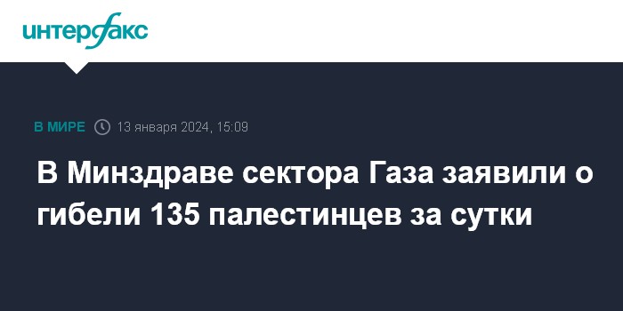 Москва. 13 января. INTERFAX.RU - Еще 135 палестинцев за последние 24 часа стали жертвами боев в секторе Газа, сообщает в субботу телеканал Al Jazeera со ссылкой на данные Минздрава анклава.