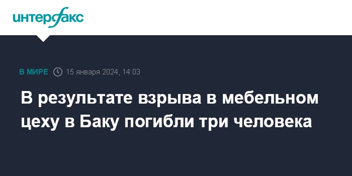 Москва. 15 января. INTERFAX.RU - В результате взрыва в понедельник в мебельном цеху в Баку, по предварительным данным, погибли три человека, их тела извлечены из-под завалов.
