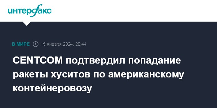 Москва. 15 января. INTERFAX.RU - Центральное командование ВС США (CENTCOM) подтвердило, что выпущенная йеменскими хуситами ракета попала по американскому судну.