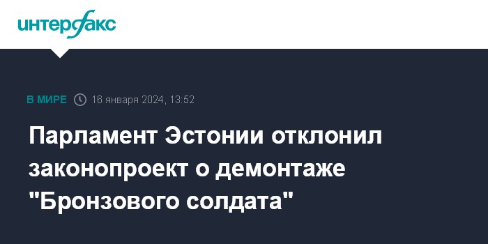 Москва. 16 января. INTERFAX.RU - Парламент Эстонии отклонил подготовленный фракцией Консервативной народной партии (EKRE) законопроект о демонтаже памятника советским солдатам, освобождавшим Таллин от немецких фашистов.