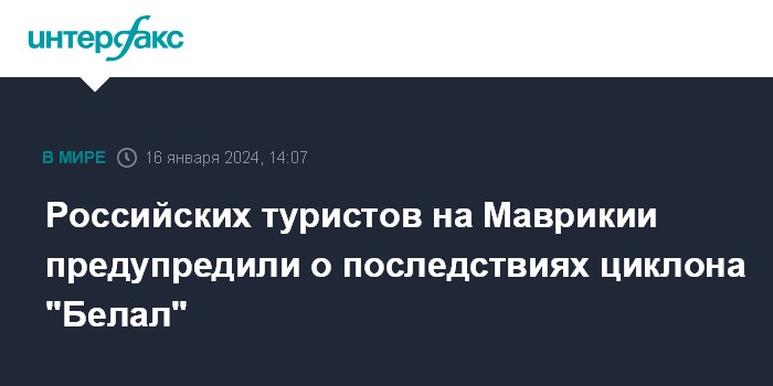 Москва. 16 января. INTERFAX.RU - Находящимся на Маврикии российским туристам советуют соблюдать меры предосторожности и оставаться в безопасных местах из-за возможных последствий прохождения циклона "Белал" необходимо соблюдать меры предосторожности и оставаться в безопасных местах, сообщает посольство России на острове.
