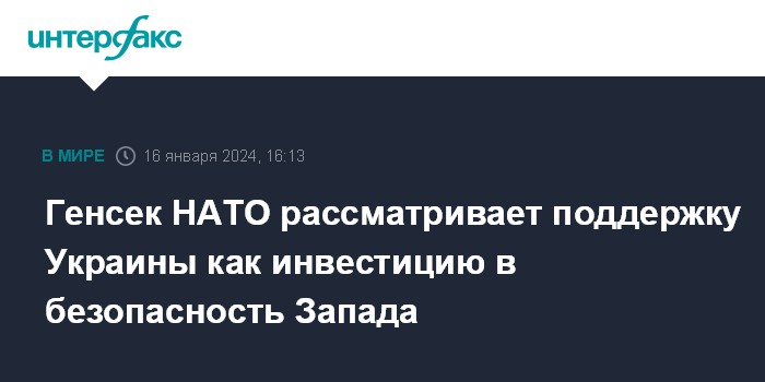 Москва. 16 января. INTERFAX.RU - Генсек НАТО Йенс Столтенберг призвал продолжать поддерживать Украину, пояснив, что считает это не благотворительностью, а инвестицией в безопасность стран Запада.