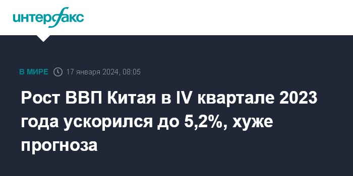 Рост ВВП Китая в IV квартале 2023 года ускорился до 5,2%, хуже прогноза