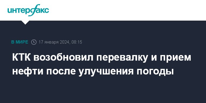 "Нормализация погодных условий позволила 17 января 2024 года КТК возобновить штатную работу морского терминала компании. Произведена швартовка танкера на ВПУ-2. (...) Прием нефти от грузоотправителей также возобновлен в штатном режиме.", - сообщает консорциум.