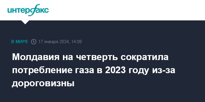 Москва. 17 января. INTERFAX.RU - В 2023 году объем потребления газа в Молдавии сократился почти на четверть по сравнению с предыдущим годом, сообщил председатель правления АО "Молдовагаз" Вадим Чебан.