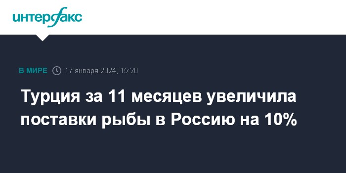 Москва. 17 января. INTERFAX.RU - Турция за 11 месяцев 2023 года поставила в Россию рыбу на $300 млн, что на 10% больше, чем за аналогичный период 2022 года. За последние пять лет поставки в стоимостном выражении выросли почти в 3,5 раза, сообщает Рыбный союз со ссылкой на данные статистики Турции.